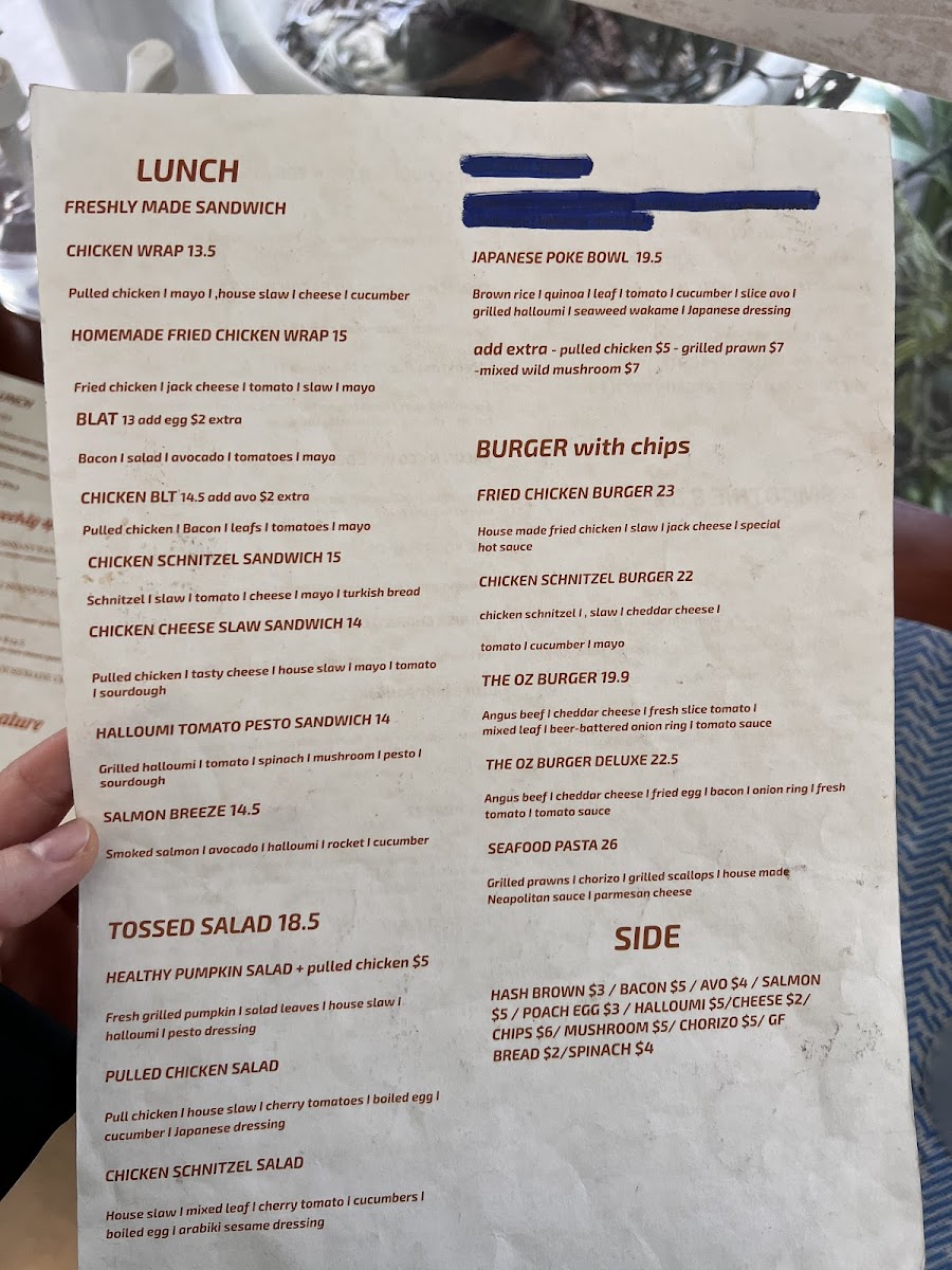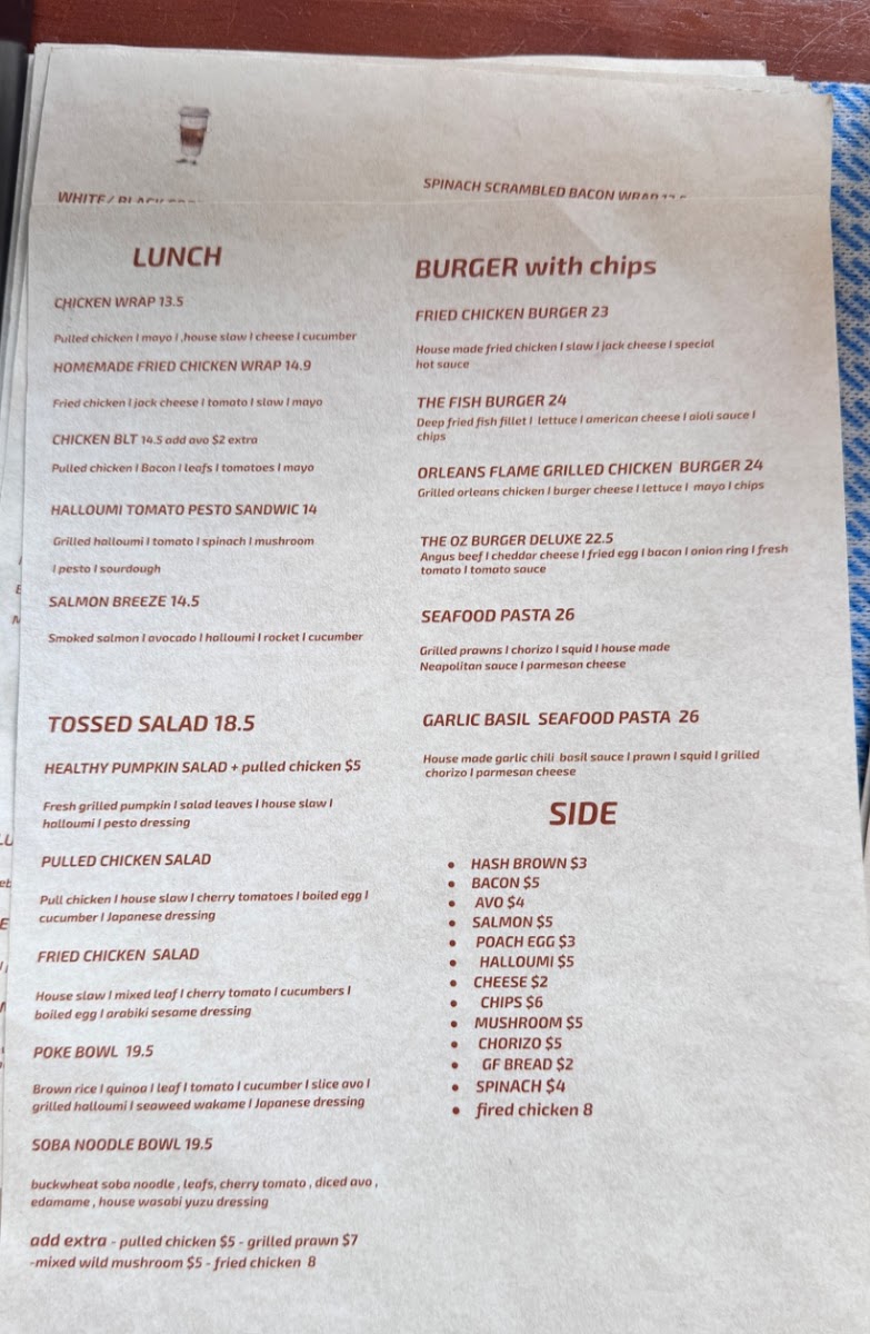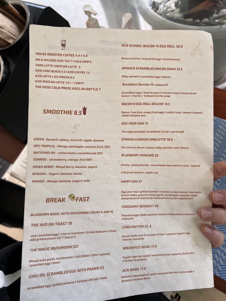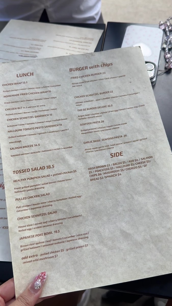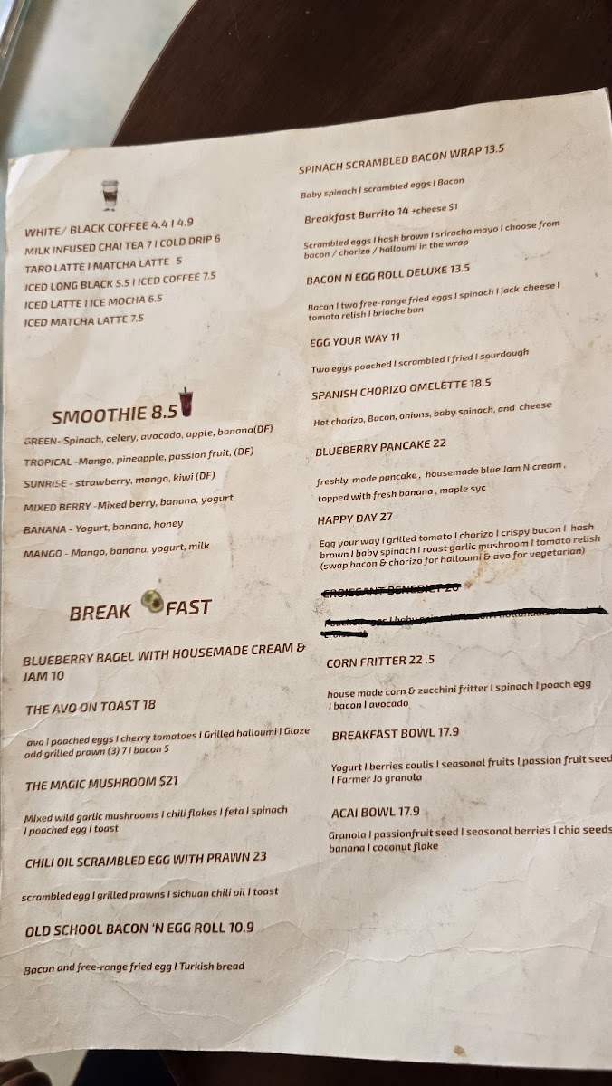 Expect to find a range of options that suit different times of day—from the heartiness of a breakfast wrap or mushroom toast to lighter choices like an acai bowl. The drinks menu complements this with smooth coffee variations such as mocha and milk foam cold brew, alongside refreshing options like a blueberry shake or sparkling water.